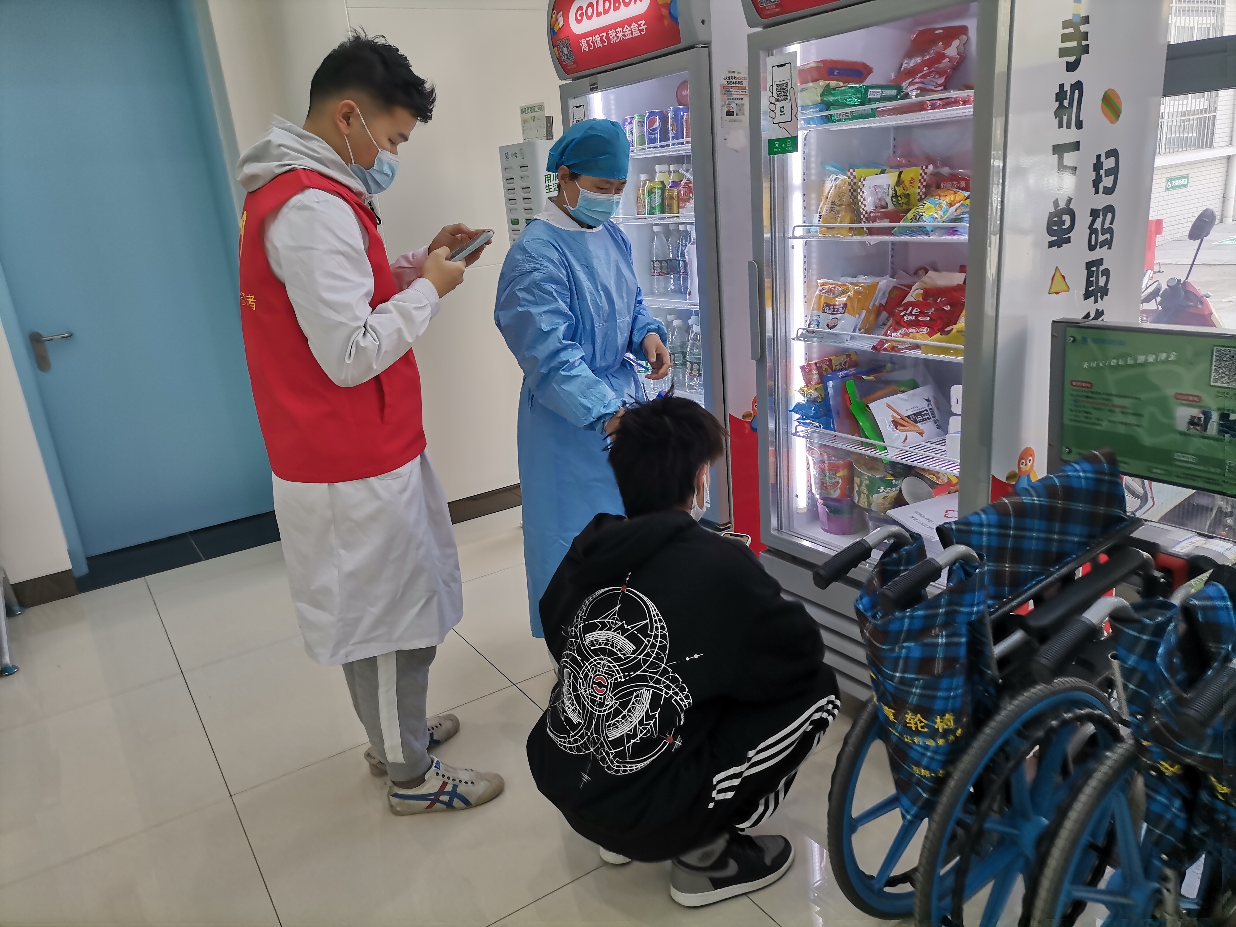 4日早上,杨熊军同学在做志愿服务时,看到一名青年男子在自助贩卖机旁想要买东西,却无法站立,蹲下蜷缩成一团。他立刻察觉到该名男子可能身体不适,随即走近身去,看到男子眉头紧锁,十分难受的样子。他赶紧询问患者情况,了解到患者目前腹痛乏力,想买贩卖机里东西。杨同学毫不犹豫拿出自己的手机,帮助患者操作购买,并协助患者到医院坐椅上休息。