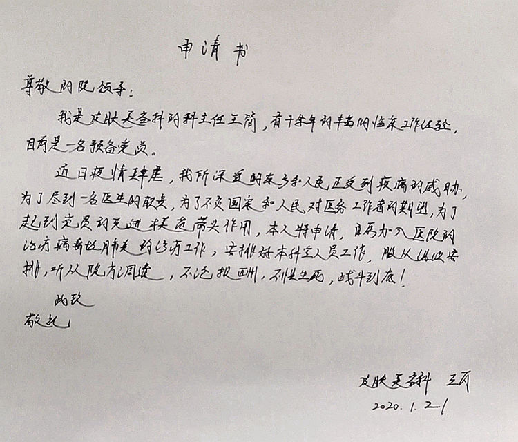 皮肤科主任王简,是一名新党员,在第一时间,第一个向医院递交了请战书,主动要求到发热门诊上班。