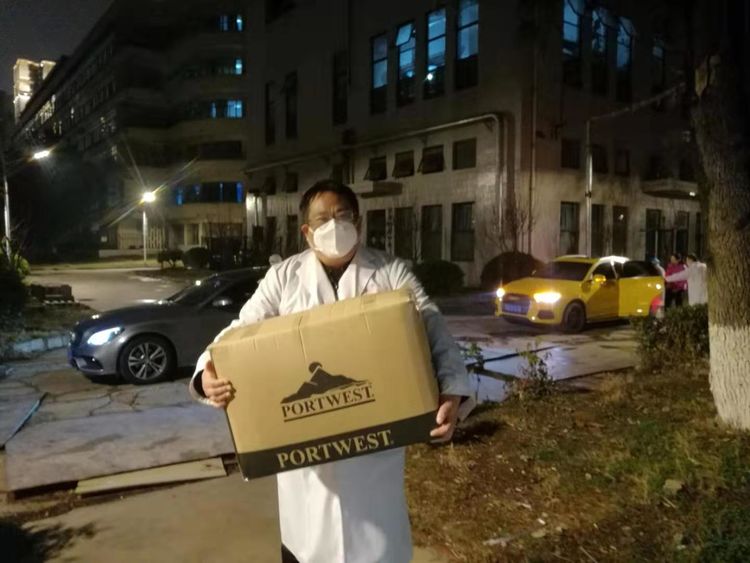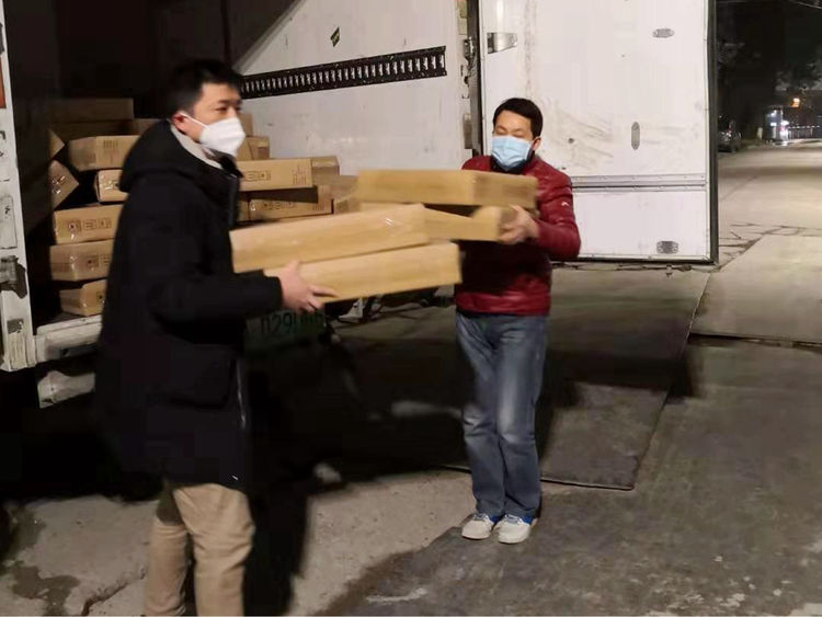 不一会儿大家就把满满一车防护服、紫外线灯、医用消毒液、牛奶、苹果、面包下货到了仓库。