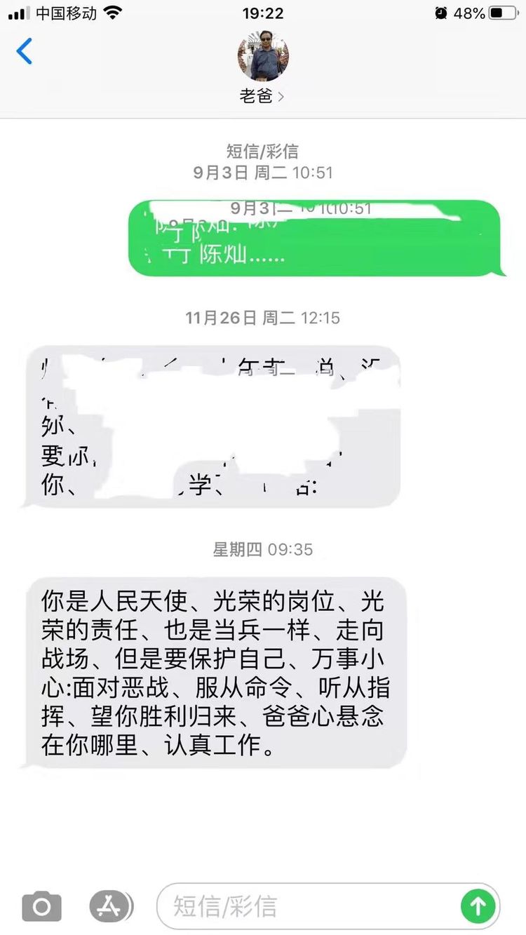 护士陈灿,主动请缨参加春节期间隔离病房的护理工作,由于春节不能回家,她对父亲说:“作为一名医护人员我有责任为人民的生命健康奋斗在临床一线。去年答应要和你吃年饭,今年又食言了。自从我成为一名护士以来,能和你们一起的时间就更少了。我们是病人的守护者,无论什么时候,我们都必须奋斗在第一线”。其父亲在短信中鼓励道:“你是人民天使,光荣的岗位,光荣的责任,也是当兵一样,走向战场,但是要保护自己。万事小心,面对恶战,服从命令,听从指挥,望你胜利归来……”。她在朋友圈中写到:这几天奋斗在一线,心累了,觉得委屈了,只要看看爸爸发的短信,瞬间就来神了……。其实前线战士最需要的就是家人的理解和支持,家人的鼓励是他们最坚强的后盾。