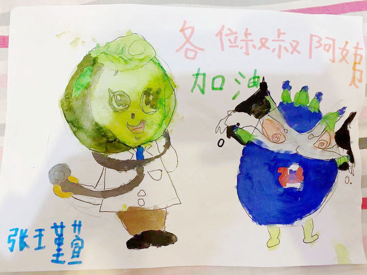 今天是护士王露奋战一线的第二十二天,忙碌的工作终于结束。手机响起,原来是家人传来一张漫画,主题是战胜病毒大魔王,关于当下疫情的。看到这张稚嫩的漫画和可爱的字体,内心一下子就被融化了。这幅画的作者是王露的大女儿,她已经很久没有妈妈的陪伴,但是她也很懂事,知道妈妈最近很忙。小萱萱就以漫画的形式传递着爱,表达着爱,希望妈妈能早日回家,叔叔阿姨们早日战胜病毒!