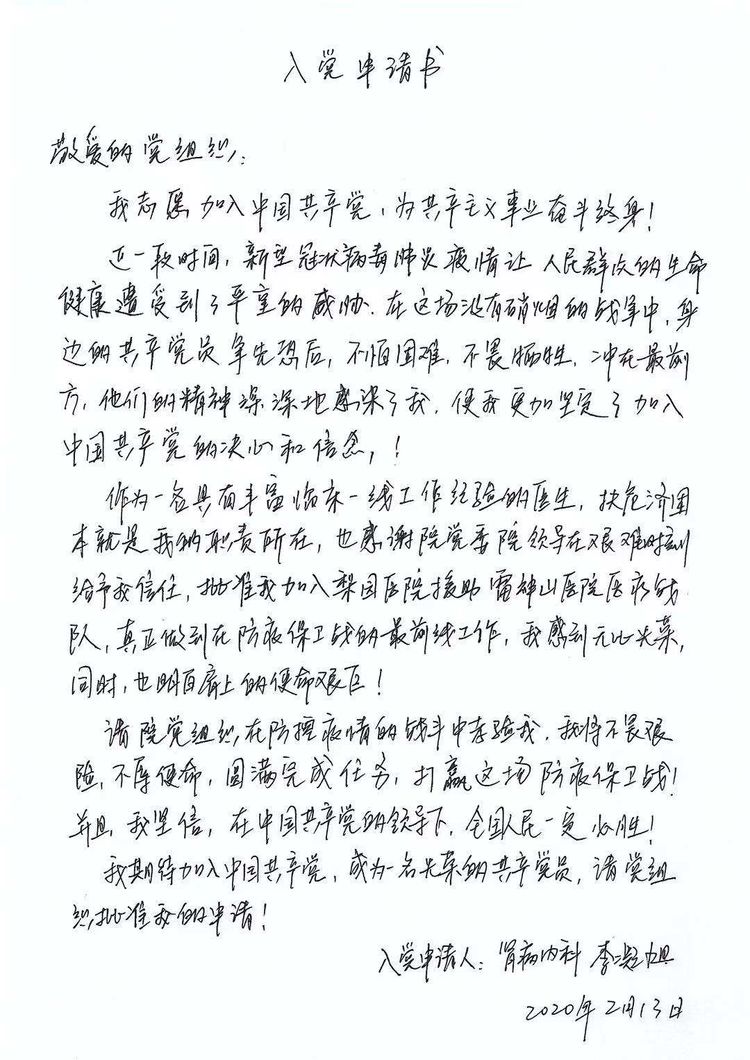 医疗队队长李凝旭同志也在第一时间递交了火线入党申请书,愿在防控疫情的战斗中接受党组织考验,带领团队圆满完成任务。