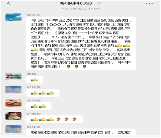 上海疫情日益严重,牵动着无数人的心。4月2日下午3点,雷竞技官方入口 呼吸科群里收到了廖珍慧护士长发的紧急通知,我院需要15名医护人员参与援沪抗疫。大家争先恐后,踊跃报名。最后呼吸科选派了三名医护人员应战——医生金玲玲、护士李梦雪、徐伟。闻风而动脚步匆匆,疫情就是无声的命令,次日凌晨她们便紧急出发前往上海了。