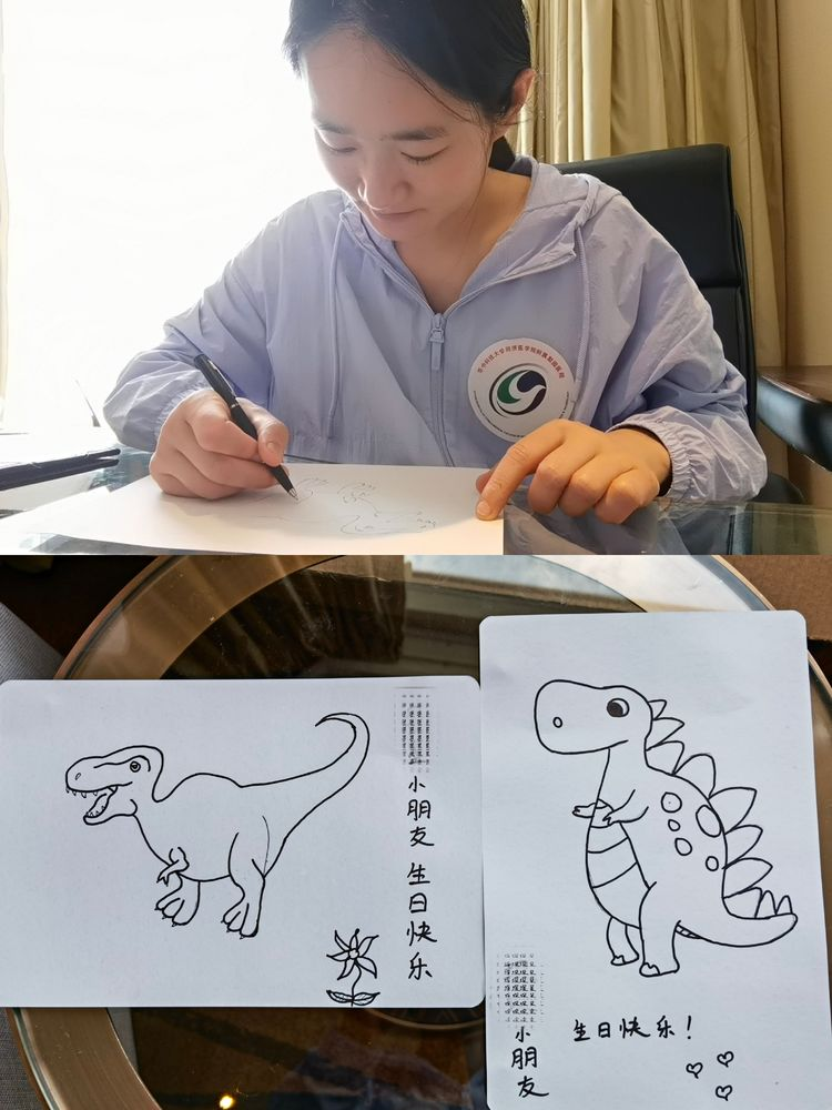这时夏丹玲和吴晓送来了及时雨,把自己唯一的两盒鸡蛋糕拿来了,解决了生日蛋糕的问题,而褚甜就地取材,利用酒店的笔和纸,给两个小朋友做了两张贺卡,特意画上了男孩子最喜欢的恐龙!