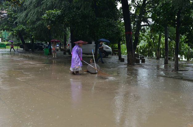 6日凌晨4点物业公司在查巡医院园区积水是否通畅时,发现老门诊积水严重,物业公司即刻组织人员打开下水道井盖,加大水流速度,并安排专门人员在井口旁提示过路行人车辆。