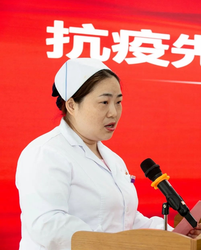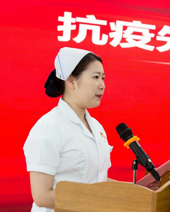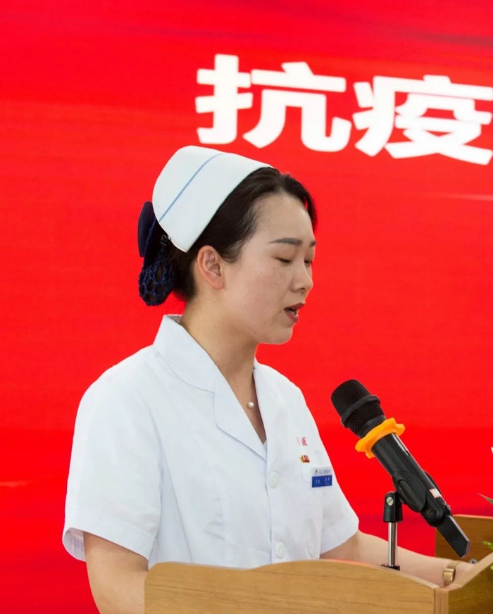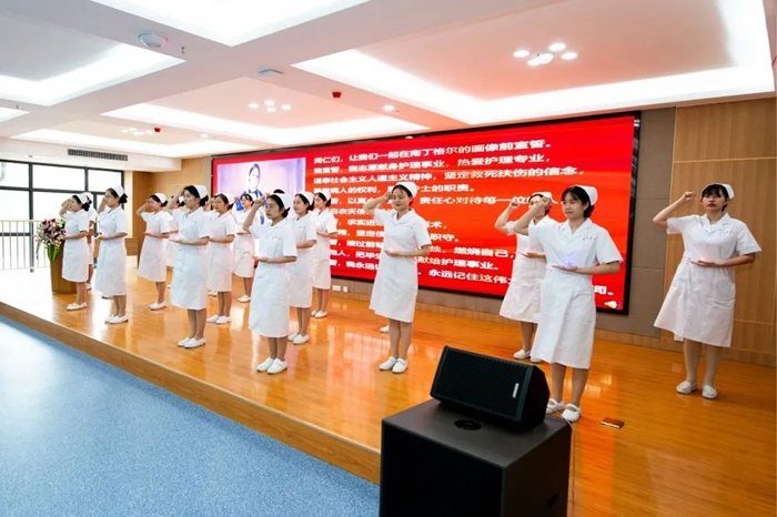 颁奖仪式后,20余名2020年新入职护士在南丁格尔的画像前进行了庄严宣誓。随后,在抗击新冠肺炎疫情中表现突出的护士代表:临危受命临时担任感染一科护士长魏亮、赴方舱医院援助的护士长盛静、赴雷神山医疗队副护士长陈力萌分别作了发言,她们用朴实的语言讲述了在抗击疫情阻击战中,白衣执甲,逆行出征,战胜疫情的动人事迹,彰显了我院护理人员“敬佑生命、救死扶伤、甘于奉献、大爱无疆”的崇高职业精神。