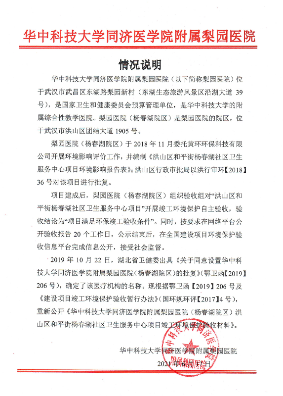 华中科技大学同济医学院附属雷竞技官方入口 (杨春湖院区) 洪山区和平街杨春湖社区卫生服务中心项目 竣工环境保护验收公示