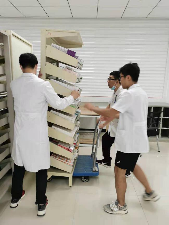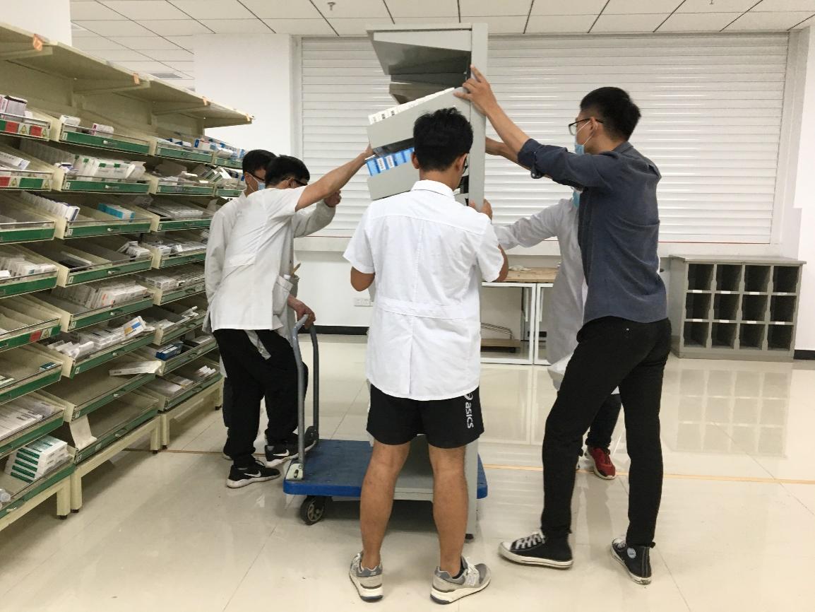 为了不影响正常的诊疗秩序,搬迁工作定于中午12时开始,药剂科全体药师及学生党员严阵以待,有条不紊快速完成药品,物品转移与归类,并且对门诊就医取药患者无缝衔接服务。