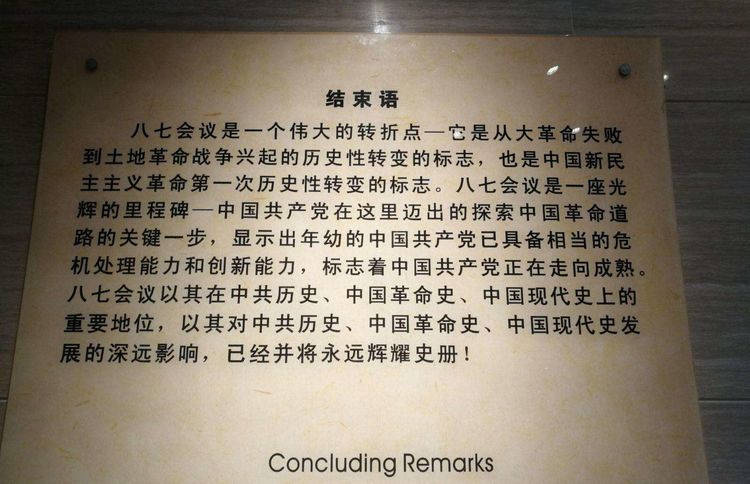 参观“八七会议”会址,回到当时的历史情境,我更能领会习近平总书记曾经讲到的:“从革命斗争的这种失误教训中,毛泽东同志深刻认识到,面对中国的特殊国情,面对压在中国人民头上的三座大山,中国革命将是一个长期过程,不能以教条主义的观点对待马克思列宁主义,必须从中国实际出发,实现马克思主义中国化。” 在马克思主义中国化的进程中,“八七会议”至少有三大功绩:把土地革命确定为中国革命的中心任务,为新民主主义革命相关理论的形成奠基;把武装夺取政权作为中国革命的唯一途径,为农村包围城市、武装夺取政权的中国式独特革命道路理论的形成奠基;实现了党的组织和斗争方式的历史性转变,为党的组织建设相关理论的进一步成熟奠基。