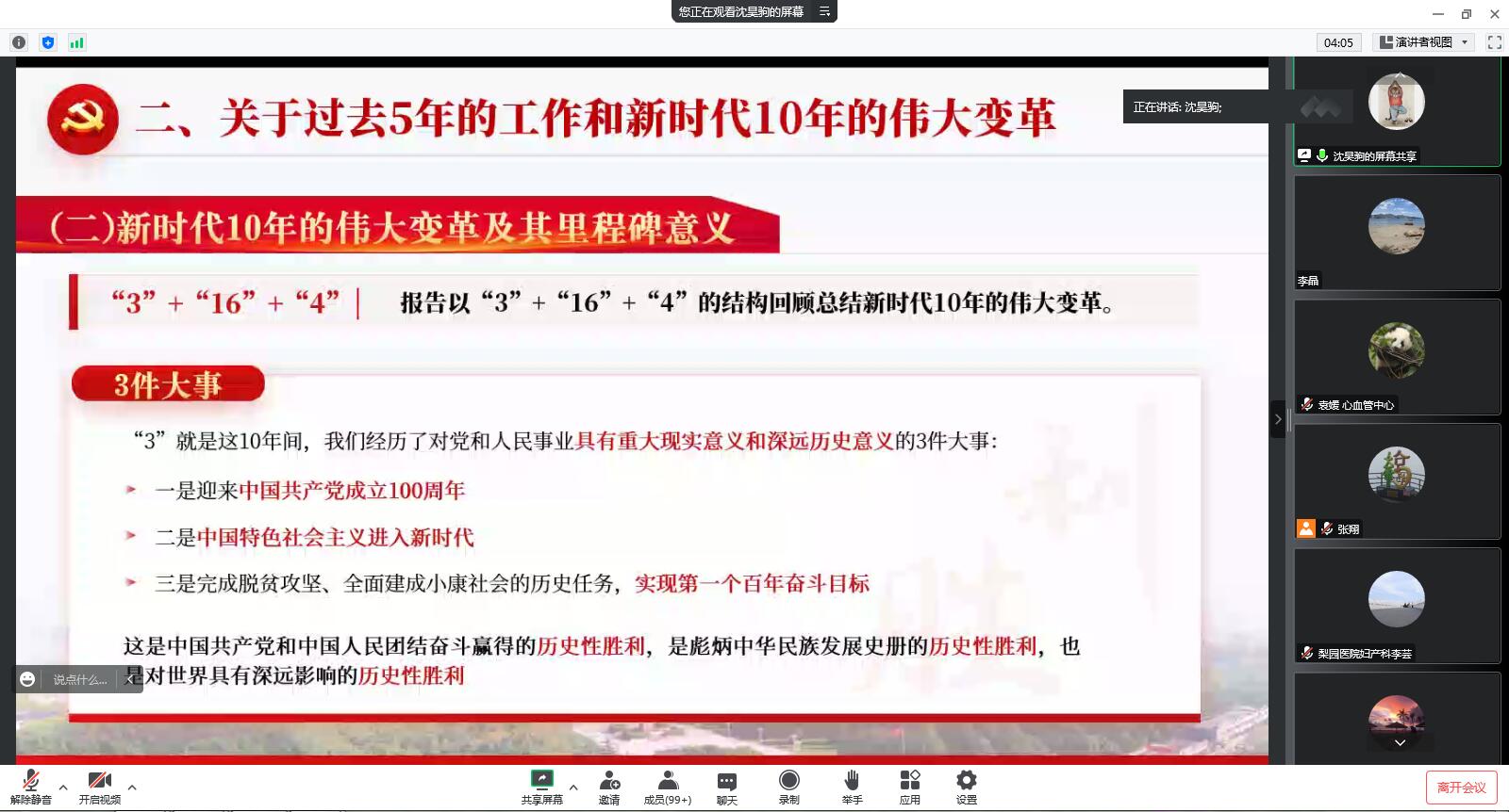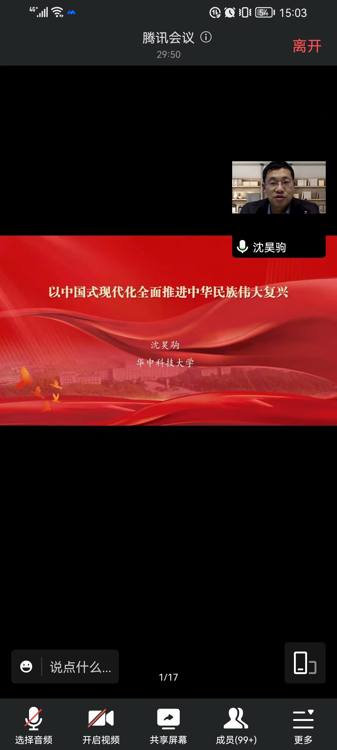 11月22日下午3时,雷竞技官方入口 特邀华中科技大学党的二十大精神宣讲团成员、马克思主义学院副院长、研究生导师沈昊驹教授通过线上会议进行党的二十大精神理论宣讲。全体院领导、各党支部书记、教职工代表及学生代表150余人参加了会议,宣讲会由医院党委书记姚济华主持。