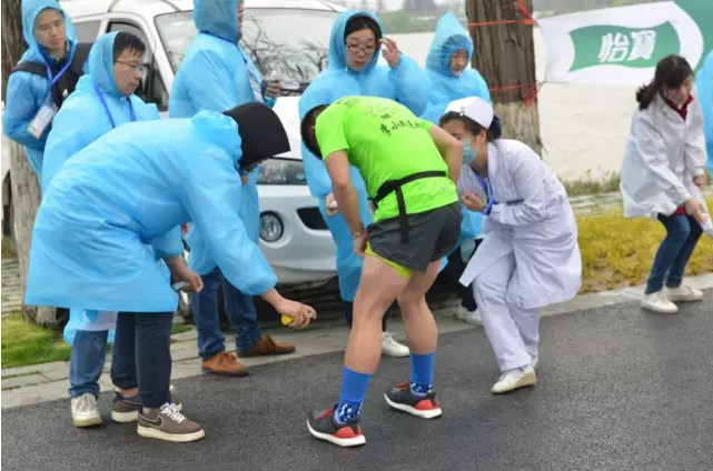 期间,一直有参赛者出现腿部肌肉劳损的情况,我院医护人员为参赛者不断按摩,喷洒药水止痛。
