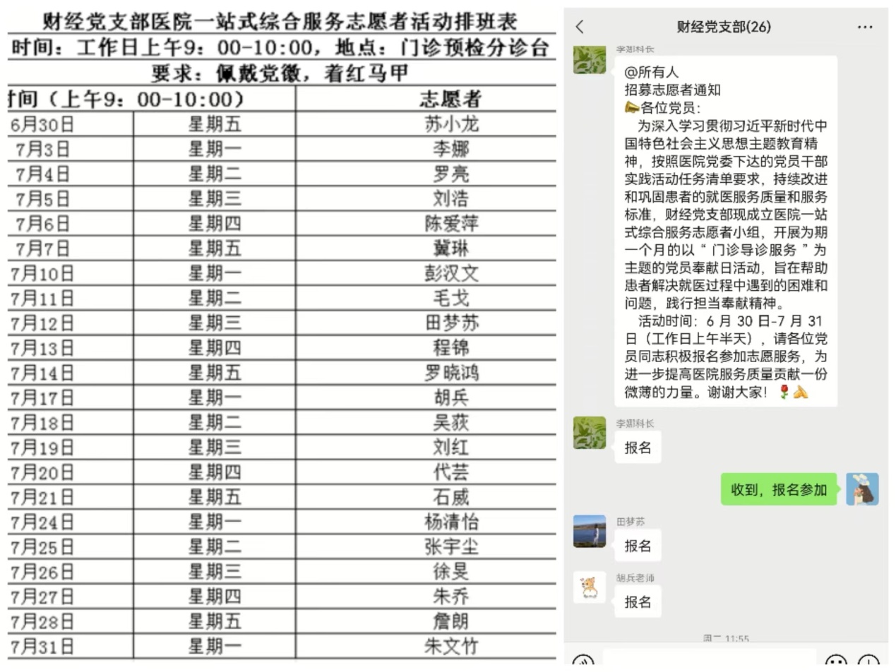 院党委负责联系财经支部的舒坦副院长每天到现场指导支部志愿者服务活动,要求志愿服务做到有温度、有质量、有实效。每天上午是门诊患者就医的高峰期,志愿者们穿上红马甲、佩戴着党徽驻守在门诊人流最密集的区域,对不熟悉就诊流程的患者提供手把手服务,帮助他们完成挂号、缴费、退费、打印清单等流程,协助行动不便的老弱病残孕患者完成信息登记、取药、取化验单,提升了患者就医感受,也进一步推广自助就诊流程和电子医保的使用。