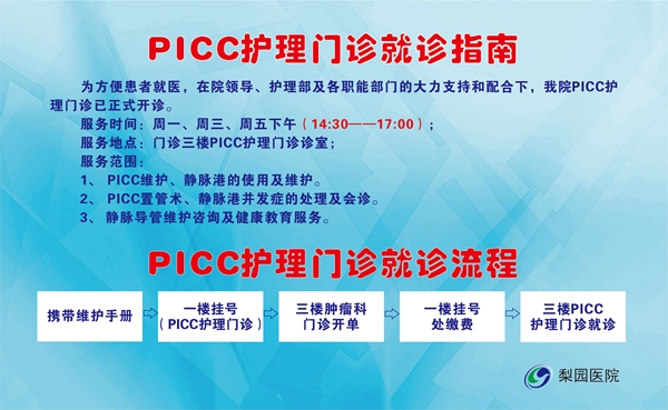 随着PICC置管及带管出院患者的逐渐增多,导管规范、安全维护与便民服务的重要性日益凸显。为了更好的方便患者,规范带管患者治疗间歇期的导管维护,为PICC置管患者提供连续、优质、高效的专业化护理服务,10月份我院PICC专科护理门诊正式开诊,由PICC专科护士坐诊,主要开展服务项目:院内外带管患者的PICC维护、静脉港维护、静脉治疗并发症的处理、带管期间健康教育等。服务时间:周一、周三、周五/下午(14:30——17:00)服务地点:门诊三楼PICC护理门诊诊室。