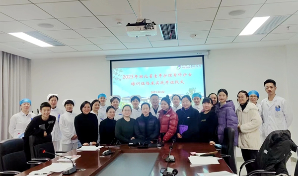 2023年2月22日上午,护理部在5楼会议室举行了湖北省老年护理专科护士临床实践培训班开班典礼。副院长徐向阳、护理部主任龚玉枝、副主任黄红艳、副主任李媛媛、基地老年专科护理护士长、教学骨干,以及来自湖北省武汉市、利川市、汉川市、应城市、宜城市、咸宁市、荆门市、十堰市等医疗机构的11名学员共同参加了此次开班典礼。