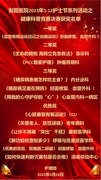 本次健康科普竞赛,通过微视频的形式宣教健康小知识,充分发挥了护士在疾病预防保健和健康教育中的作用,并为广大患者普及健康常识和应急救护能力,提升护士在患者及影响医疗健康决策者心中的价值,不断增强我院护理工作者“关爱、尊重、专业、安全”服务理念,促进我院护理工作全面、协调、持续发展。