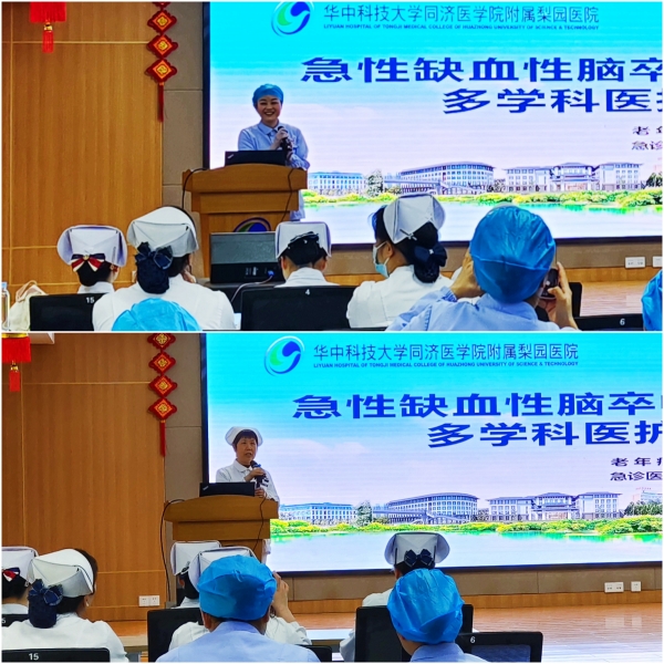 急诊科护理团队着重讲解了关于卒中早期识别的方法和卒中急救技能,让护理人员在紧急情况下能够专业、迅速、准确的做出判断并进行救治。脑卒中中心团队向大家介绍了院前120及院内急诊一旦识别出患者有脑卒中症状,立即开通急诊绿色通道启动脑卒中联合处置的护理流程。