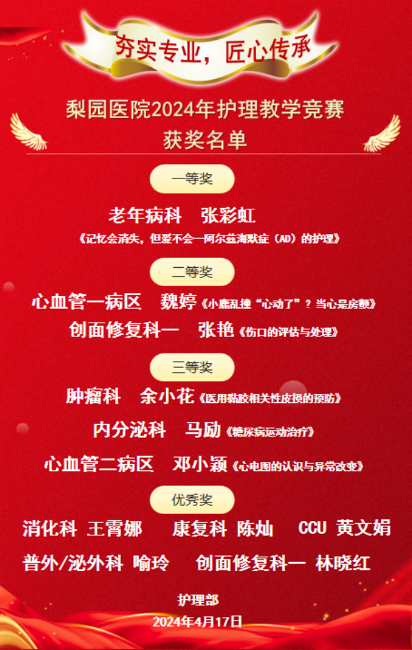 围绕国家卫健委《全国护理事业发展规划(2021-2025年)》、《进一步改善护理服务行动计划实施方案(2023—2025年)》等文件精神,为进一步提高我院护理人员临床教学质量和教学水平,促进临床带教老师之间的教学经验交流,激励临床带教老师不断探索和尝试创新的教学方法。4月17日,护理部在学术报告厅开展“夯实专业,匠心传承”护理教学竞赛活动决赛。竞赛由护理部副主任黄红艳主持。