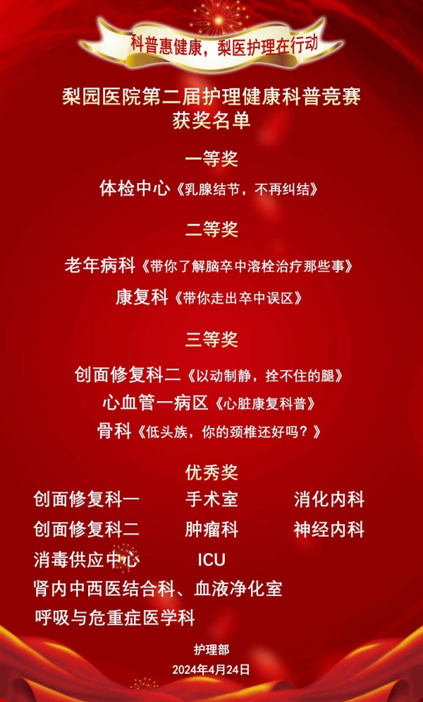 围绕国家卫健委《全国护理事业发展规划(2021-2025年)》、《进一步改善护理服务行动计划实施方案(2023—2025年)》等文件精神,为促进我院护理工作专业化、系统化发展,贯彻落实健康中国战略,进一步增强健康科普的传播力、引导力、影响力和公信力,提升患者和公众对护理学科的认识和理解,增强健康保健、疾病早期预警识别和风险防范意识,提高护理人员的科学素养和护理服务能力。4月24日,护理部在学术报告厅举办“科普惠健康,梨医护理在行动”第二届护理健康科普竞赛。竞赛由护理部副主任李媛媛主持。