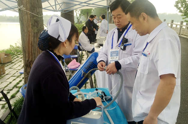 清晨5时50分,医疗保障人员就开始有条不紊地往救护车上搬运药品、调配抢救设备。6时15分,医疗保障人员到达赛场,并在医疗保障区做赛前准备。马拉松全长42.195公里,我院在赛道35公里处设有固定医疗救护点,站点前后每300米一个、共设8个医疗监测哨点,配置了呼吸机、心电图机、除颤仪、氧气袋、血压计、冰袋及急救药品等相关医药设备,对参赛运动员进行密切关注和实时救护,并确保医疗保障”绿色通道”安全畅通,随时接诊需要急救的病人。同时,院内还组建了由各科室主任及汉马组委会安排的其他医院专家共同组成的医疗急救团队在医院急诊科守候,随时接诊需要急救的病人。
