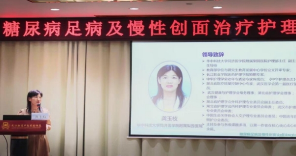 护理部主任龚玉枝致开幕词,龚主任对各位专家和护理同仁的到来表示热烈的欢迎和衷心的感谢,同时对创面修复中心专科护理独具特色的“慢性伤口护理服务品牌”及良好的社会效益,给予了充分的肯定,希望我院创面修复中心与在座的各位专家学者以本次研讨班为平台,促进慢性伤口护理新知识、新技术的交流,不断创新发展,在慢性创面护理方面,多方合力,多措并举,不断提升伤口专科护理水平,促进湖北省乃至全国伤口护理事业的蓬勃发展。开幕式由护理部副主任黄红艳主持。