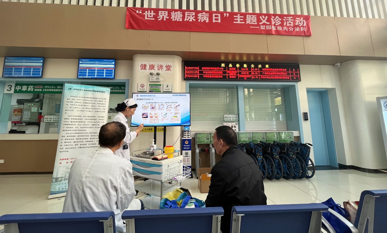 支部宣传委员刘霞护士长带领护士方小丽、吴亚兰、岳哲婷、陶晓慧、为前来义诊的患者进行健康知识讲座、免费血糖测量和血红蛋白、骨密度测量、人体成分等监测达上百余人次。“糖师”和“糖管家”糖尿病护理门诊团队围绕饮食、运动、药物治疗等方式为糖尿病患者制定个性化的健康建议,同时为患者发放了糖尿病相关知识手册,倡导健康的生活方式,让患者感受到在糖尿病日来自医院的关爱与温暖。