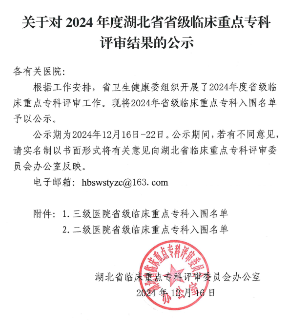 2024年12月16日,湖北省卫生健康委公布了2024年度三级医院省级临床重点专科入围名单公示,我院护理专业成功入选湖北省重点专科,这是对我院护理工作的高度肯定,同时也将鞭策我们不断加强学科建设,为维护和促进人民群众的生命健康,推动护理工作高质量发展继续努力!