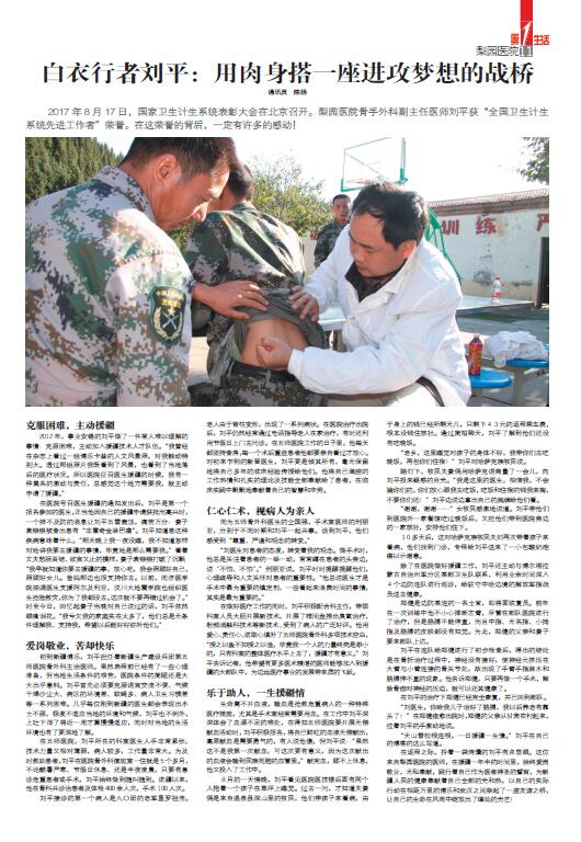 在做好医疗工作的同时,刘平积极配合科主任,带领科室人员大胆开展新技术,开展了椎间盘推出臭氧治疗,射频消融科技术等新技术,受到了病人的广泛好评。他用爱心、责任心、进取心填补了五师医院骨外科多项技术空白,