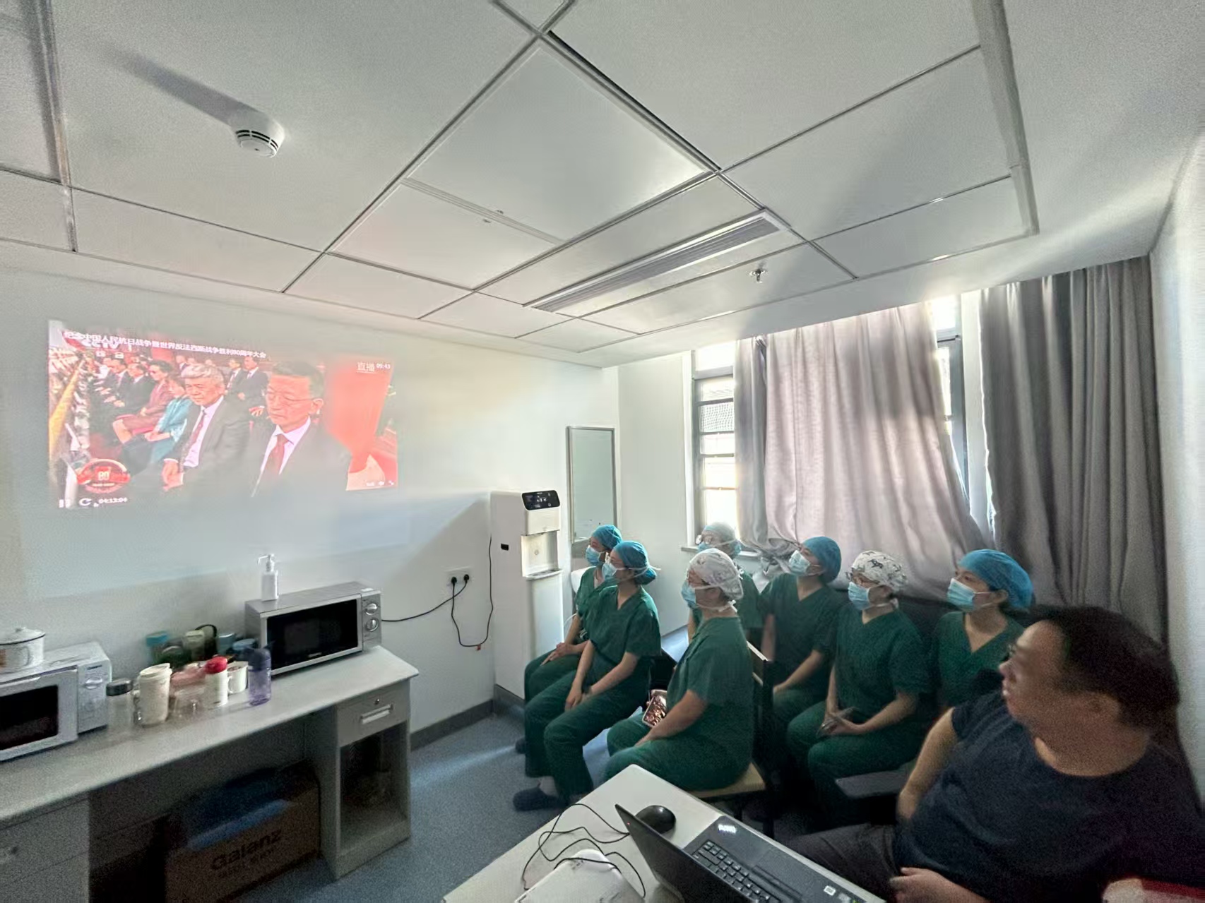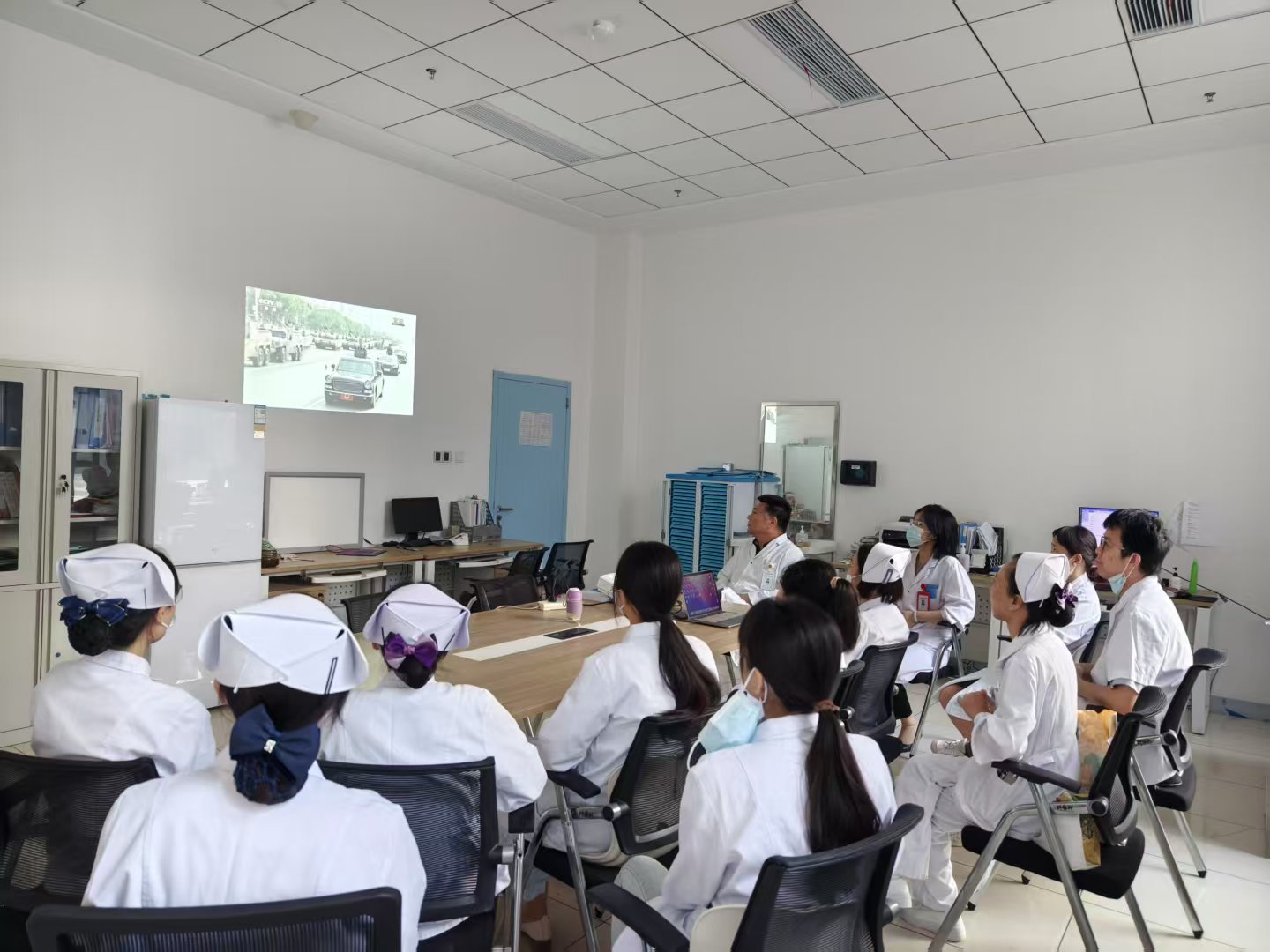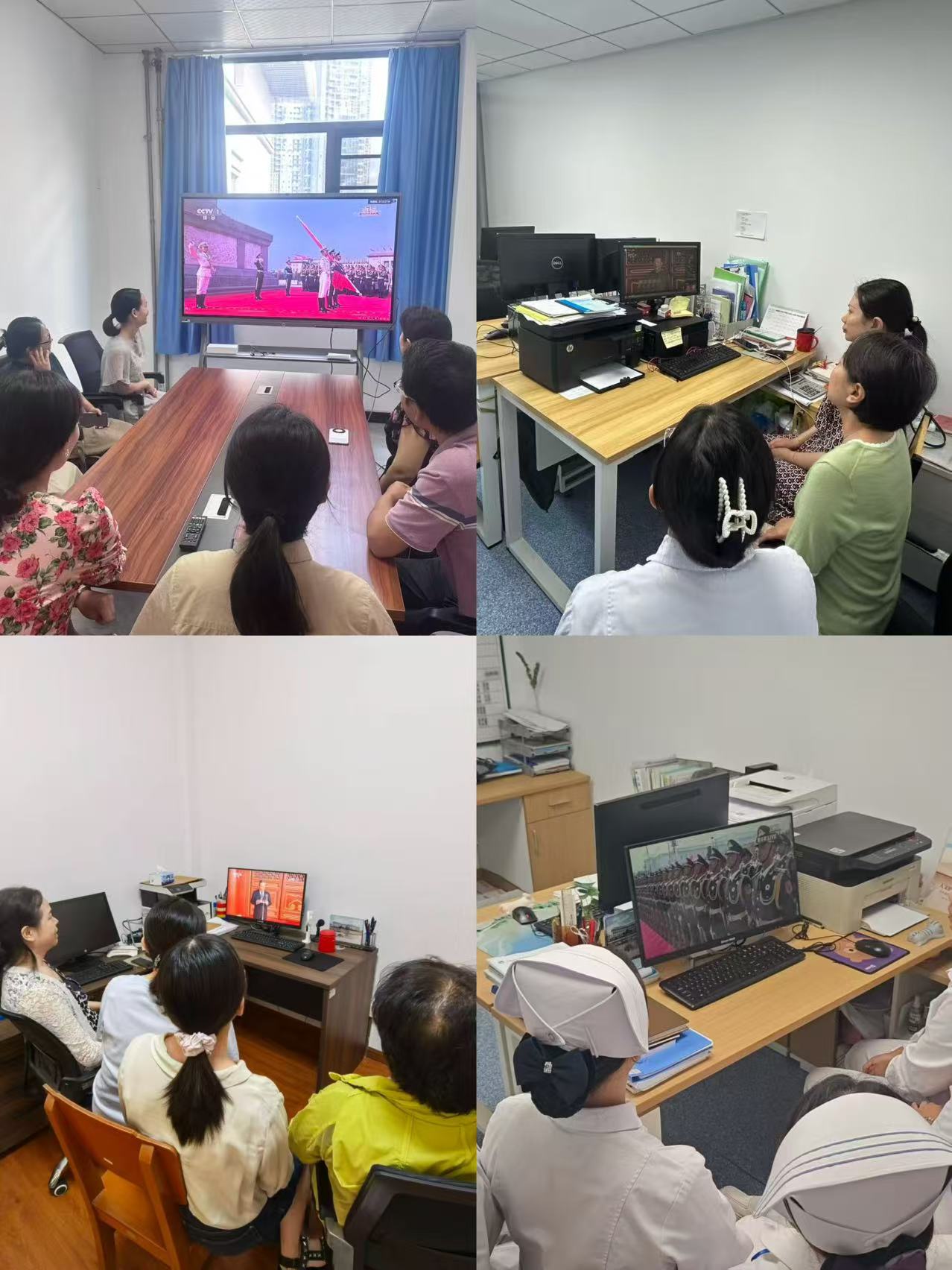 按照校党委统一安排,全体院领导及党务部门主要负责人集中在会议室进行了观看,各党支部分别组织全体职工、病友利用各种场所,以多种形式观看了阅兵仪式。
