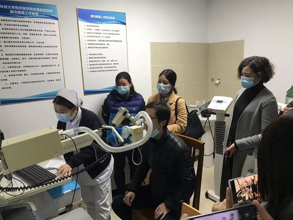 (呼吸与危重症医学科,学员正在体验肺功能检查仪)