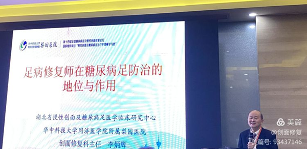 会议学术部分由雷竞技官方入口 护理部副主任黄红艳主持,雷竞技官方入口 创面修复科主任李炳辉、武汉大学人民医院东院护理办公室主任刘艳、华中科技大学同济医学院附属协和医院伤口护理中心护士长杨俊玲、武汉市第一医院创面修复与周围血管科王丽老师、雷竞技官方入口 创面修复科护士长郑洁、创面修复科血管外科护士长陈智敏、创面修复科张艳老师分别从《足病修复师在糖尿病足防治的地位与作用》、《伤口造口专科护理体系的建立与发展》、《伤口渗液的管理》、《一例重度胫前外伤长期不愈病例的诊疗展示》、《基于标准化治疗的糖尿病足创面处理》、《糖尿病足创面处理中的医护配合》、《嵌甲对糖尿病足的影响》等内容进行了精彩的授课,专家们从不同的角度向参会者介绍了糖尿病足及慢性创面治疗护理发展建设、学科护理前沿知识、慢性创面的管理和足病护理专科护士的发展方向。