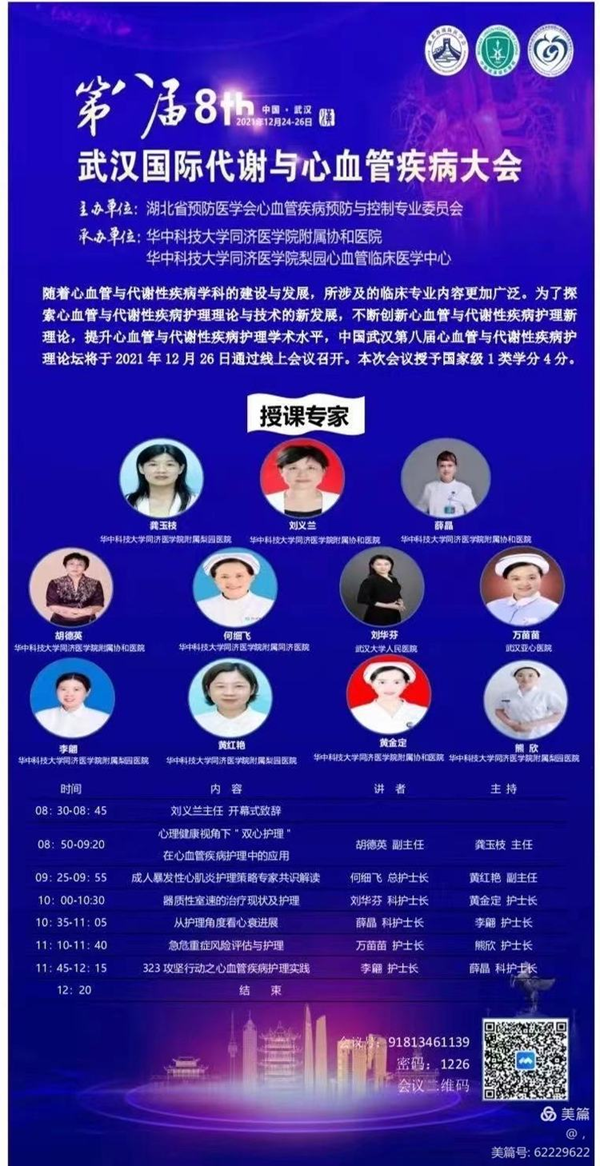 2021年12月26日由湖北省预防医学会心血管疾病预防与控制专业委员会主办,华中科技大学同济医学院附属梨园心血管临床医学中心、华中科技大学同济医学院附属协和医院承办的第八届武汉国际代谢与心血管疾病大会护理论坛通过线上直播方式顺利举行。会议邀请业内专家和240余名护理同仁齐聚一堂,共享学术盛宴。